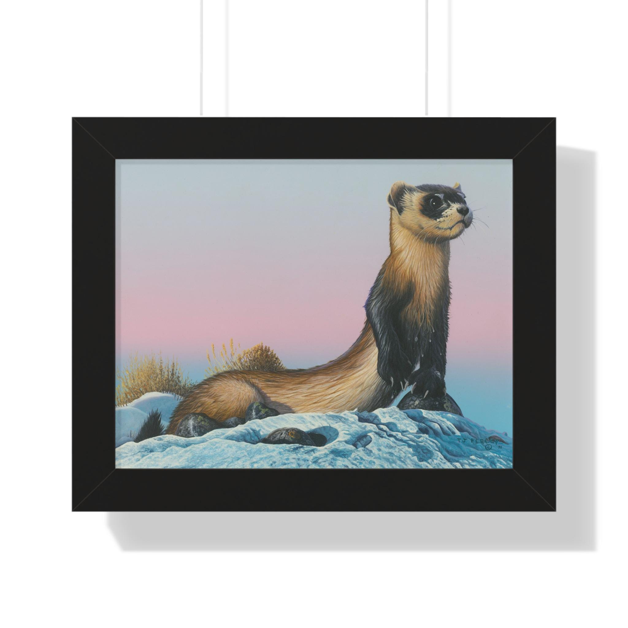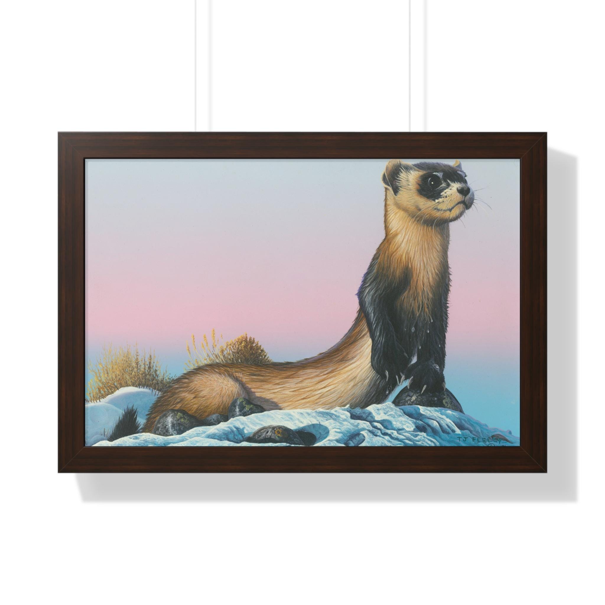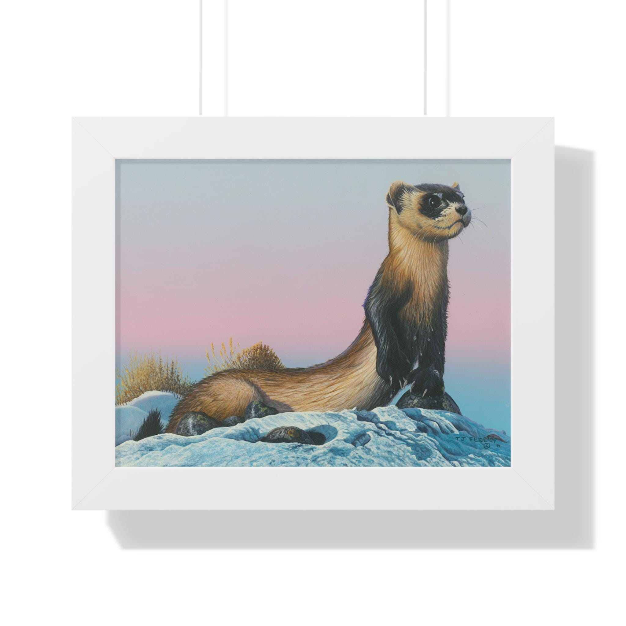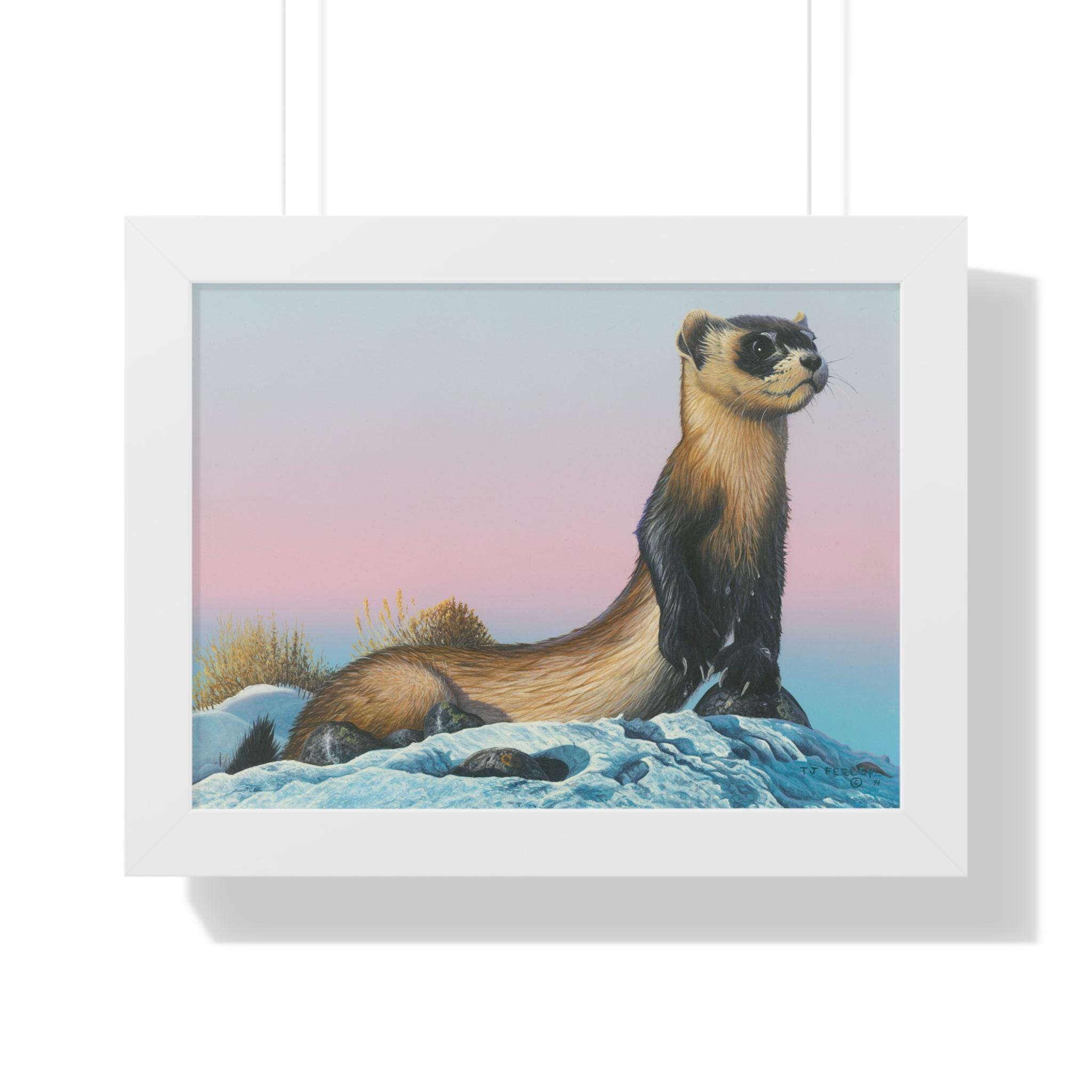 Quiet and steady, this framed horizontal poster brings a moment of winter calm into a room. The soft gradient sky and snow-dusted foreground cradle a watchful weasel-like creature—an image that reads like the hush just after sunset. The slim MDF frame and matte museum-grade paper keep the focus on the artwork while adding a refined, gallery feel. With protective acrylic covering and pre-installed hanging hardware, it arrives ready to hang and hold its color and texture for years.