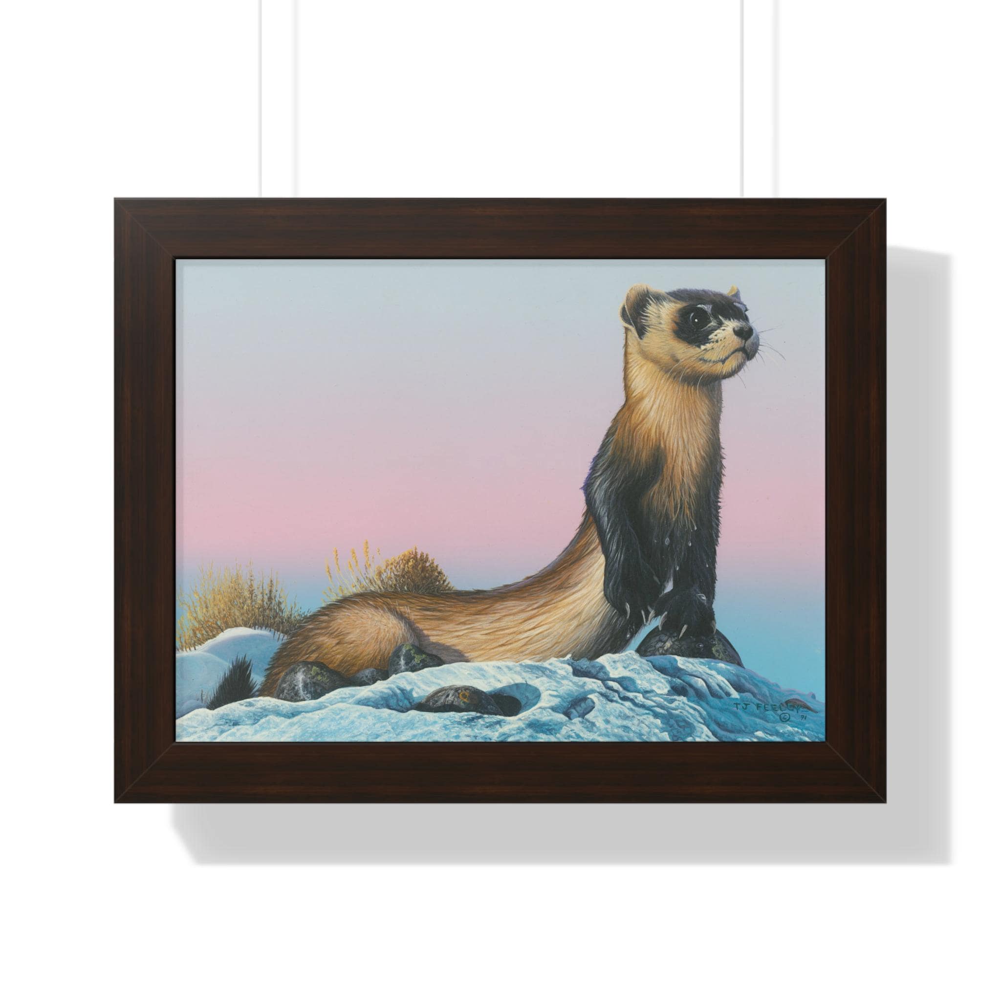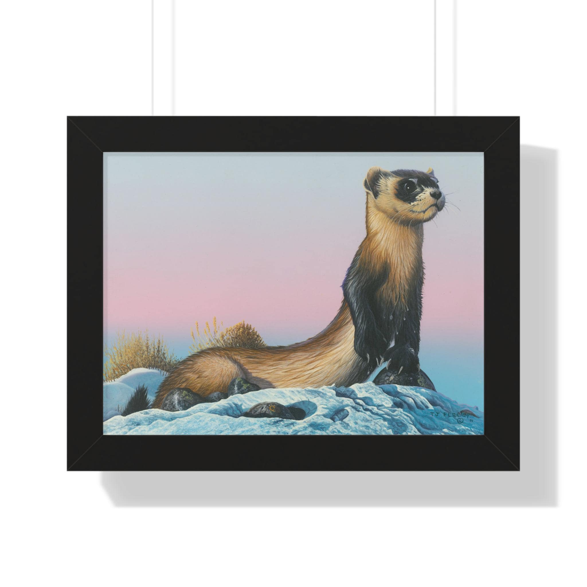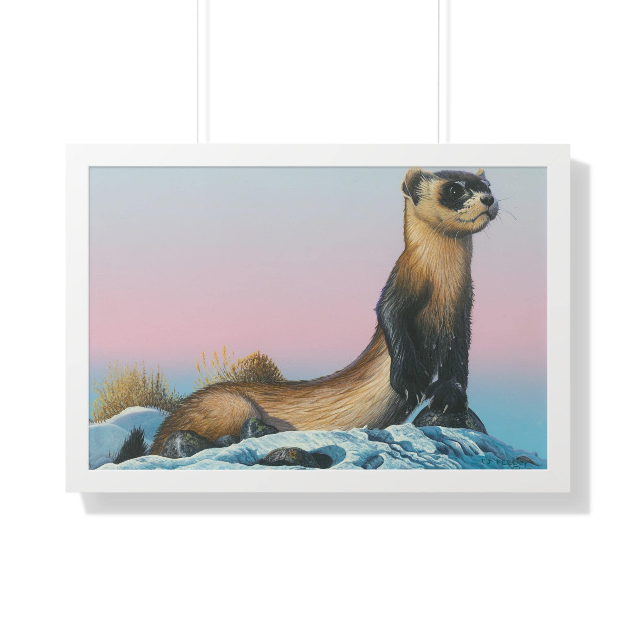 Quiet and steady, this framed horizontal poster brings a moment of winter calm into a room. The soft gradient sky and snow-dusted foreground cradle a watchful weasel-like creature—an image that reads like the hush just after sunset. The slim MDF frame and matte museum-grade paper keep the focus on the artwork while adding a refined, gallery feel. With protective acrylic covering and pre-installed hanging hardware, it arrives ready to hang and hold its color and texture for years.