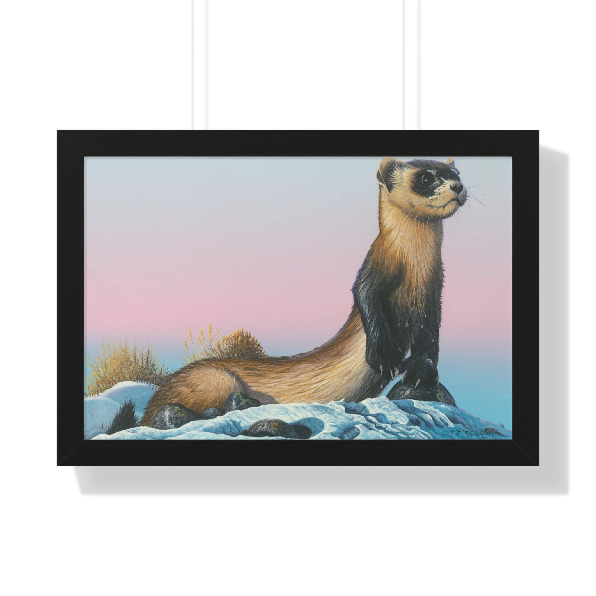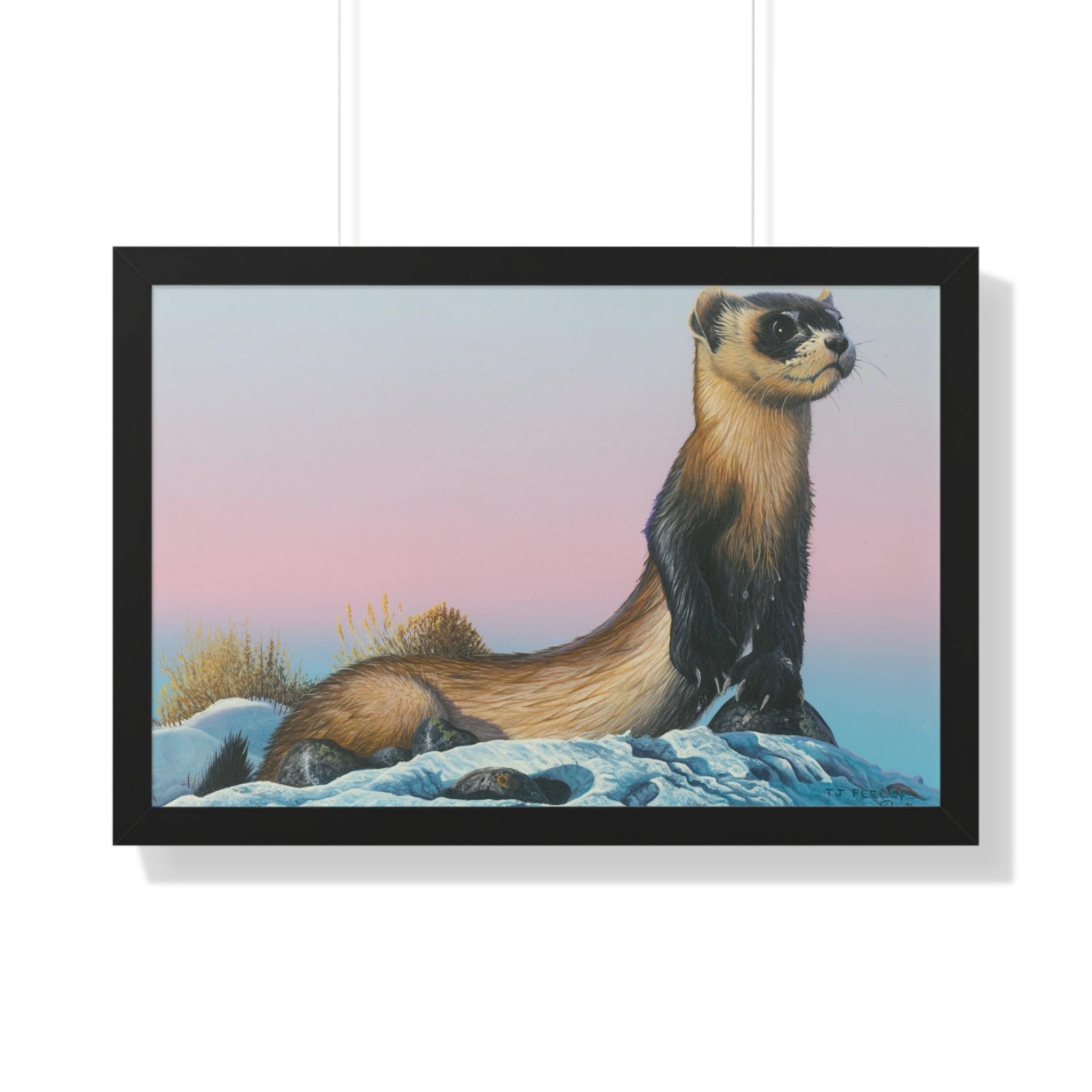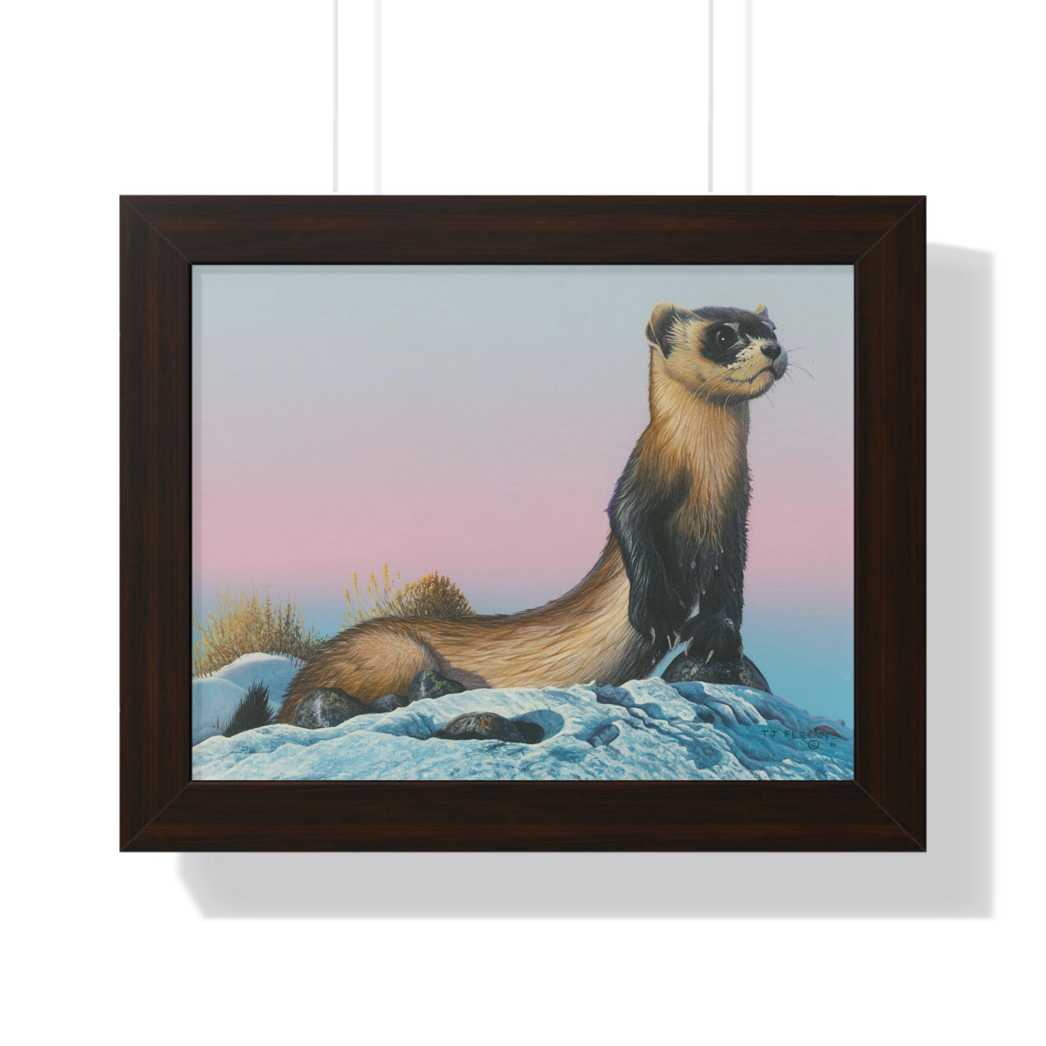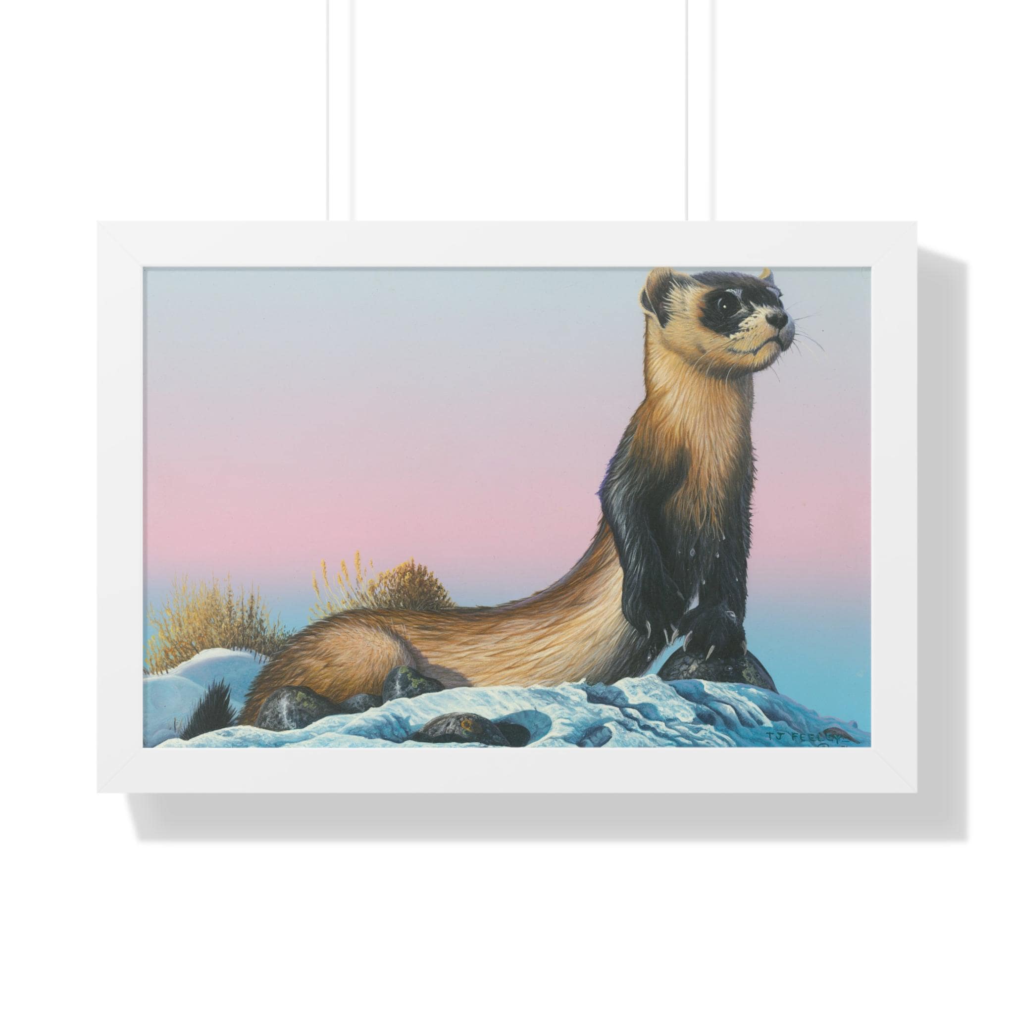 Quiet and steady, this framed horizontal poster brings a moment of winter calm into a room. The soft gradient sky and snow-dusted foreground cradle a watchful weasel-like creature—an image that reads like the hush just after sunset. The slim MDF frame and matte museum-grade paper keep the focus on the artwork while adding a refined, gallery feel. With protective acrylic covering and pre-installed hanging hardware, it arrives ready to hang and hold its color and texture for years.